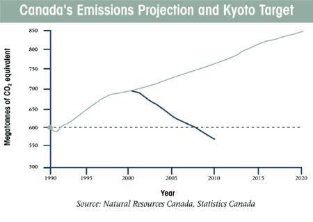 Protiv globalnog zatopljenja se treba boriti sa zdravoumnom i znastvenom politikom. Tvrda, prirodna znanost je dokazala da GZ postoji i realan je problem. (Zanemariti ću sada «klimu straha» kojom se to postiglo) Sljedeći korak je znanstveno-ekonomski dokazati troškove i benefite određenih politika borbe protiv GZ. Trgovanjem CO2 ili porezom na emisije, uglavnom nekim tržišnim mehanizmom jer znamo da je slobodno tržište puno bolji alokator od arbitralnih kvota i ugovora. Ugovor iz Kyota je jednostavno prenaivan i ekonomski loša politika za sve građane bilo koje zemlje (čak bi više platile siromašnije zemlje u razvoju od bogatijih, zato je Kyoto njih i ignorirao). Većina se uvijek šablonski, bez ikakvog dubljeg razmišljanja lovi za SAD i Australiju koje odbaciju Kyoto ugovor, i sa pravom. Nitko ne spominje one zemlje koje su potpisale ugovor i ratificirale ga, a nisu u bilo kojem smislu poduzele nešto da ga i sprovedu. I opet s pravom! Eto primjerice Kanada, tj. Liberali (što bi kod nas bilo SDP u malo boljem smislu) su ratificirali ugovor 2002, pet godina nakon što su ga potpisali. Obavezako je Kanadu da smanji emisije 6% ispod levela 1990. U međuvremenu, emisije su porasle 30% iznad levela 1990. No neću sada o zanimljivoj Kanadskoj politici. Evo grafa kako je to “trebalo” izgledati za Kanadu po državnom govoru.