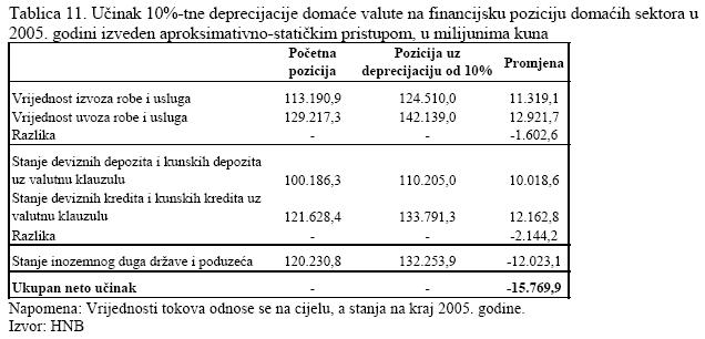 – Uglavnom, deprecijacija od 10% bi rezultirala na kraju 2005. da Hr izvoznici roba i usluga dobiju 11,3 milijarde KN više, dok uvoznici roba i usluga bi bili morali platiti 12,9 milijardi više. (negativna razlika i efekt)