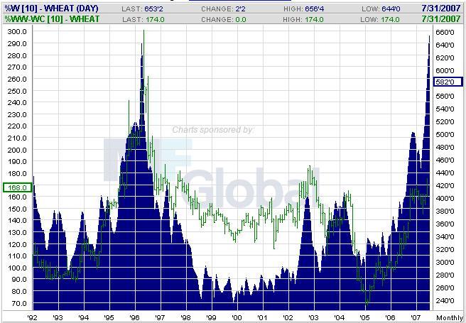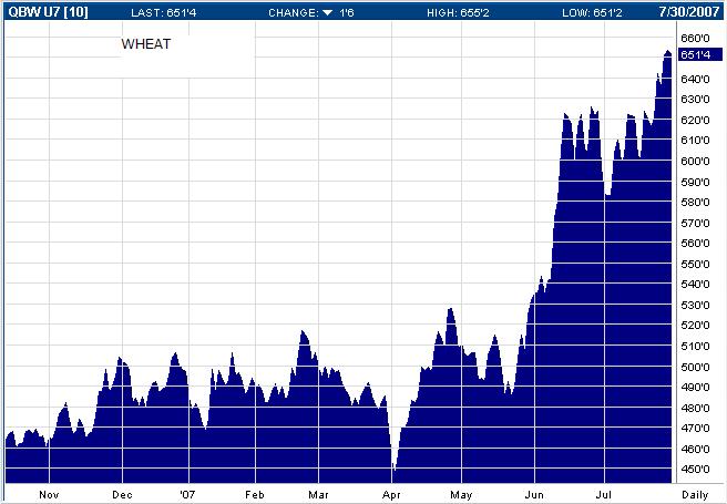 Prošlog petka pšenica je dostigla najvišu cijenu u posljednjih 11 godina (vidi graf niže). U Francuskoj cijena pšenice je iznad psihološke razine od €200, €213 po toni, a na Chicago Board of Trade (nedavno jedna od najvećih burzi u svijetu) $6.64/bushel.