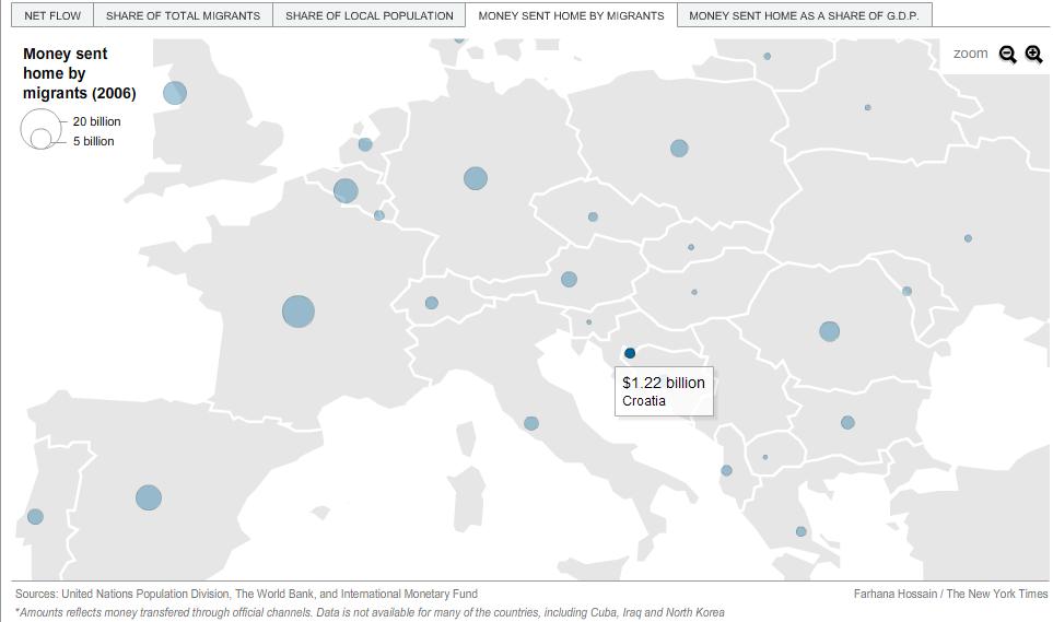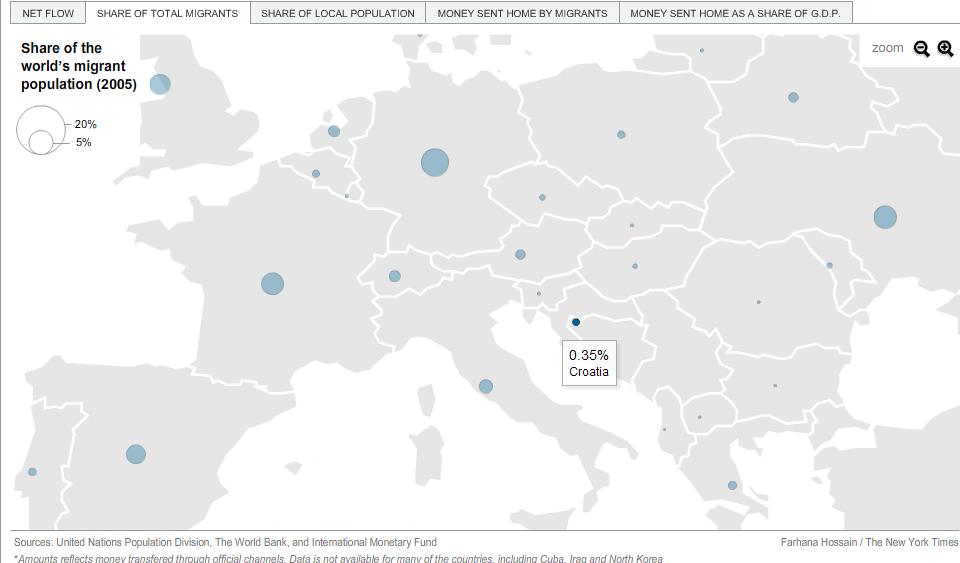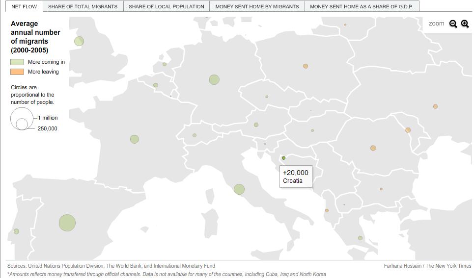 Na stranicama NYT zapazio sam interesantan i kratki pregled migracija u svijetu, u obliku interactivne karte. Cijelu kartu možete pronaći ovdje. Pregled je podijeljen u pet pokazatelja: prosječna godišnja neto migracija, udio u svijetskoj migraciji, udio migranata u lokalnom stanovništvu, novac poslan kući (doznake) i udio tog novca u BDPu. Naravno, meni je zanimljivo vidjeti kako stoji Hrvatska i regija po tom pitanju. Ovdje sam sažeo Hrvatske migracijske pokazatelje (sa slikama). Za ostale zemlje posjetite link.