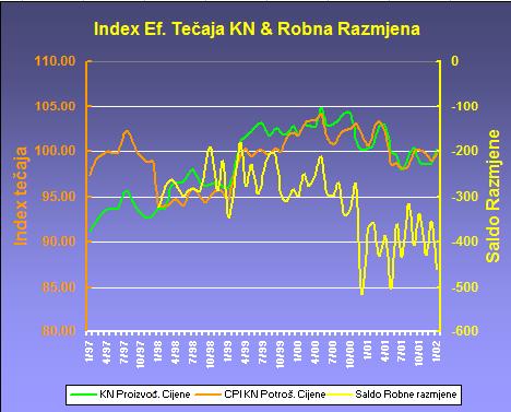 Ok, da ne bude uglavnom negativne kritike, Milanović jasno kaže “Ne vjerujem da promjena tečajne politike jamči brži rast i procvat hrvatskog izvoza.” Takva izjava mi se sviđa i dobro je da tako smatra. Treba imati na umu, kako je Velimir Šonje istaknuo na skupu HR+, da je “od zadnjeg kvartala 1996. do 2000. godine došlo do realne depricijacije kune od 17% u proizvođačkim cijenama i 11% u potrošačkim cijenama.” Sa izvozvom se ništa značajno nije dogodilo. (vidi graf dolje) Problem izvoza nije u “prejakoj” kuni kako neki vole reći, već u strukturalnim slabostima gospodarstva. I da je kuna izrazito slaba (zanemarimo sve druge negativne posljedice toga) izvoz isto ne bi procvao, upitno je da li bi se nešto i dogodilo sa njime. Ne sljedi automatski da bi proizvodili više i bolje i tako prodavali više vani.