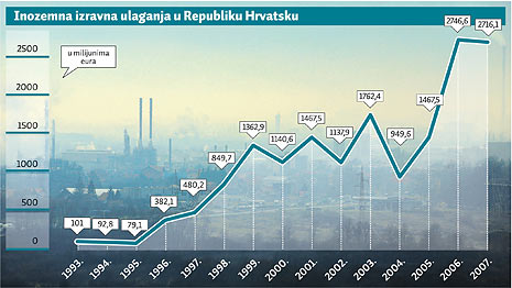 — Za kraj jedan informativan graf iz jučerašnjeg Jutarnjeg. Graf je zanimljiv jer daje dugoročni pregled FDIa sežući unazad do 1993. Podatak za 2007. je za prva tri kvartala u kojem je postignut isti rezultat za čitavu 2006. Iako je struktura FDI još uvijek nezadovoljavajuća (2/3 svih ulaganja su u financijskom sektoru zbog dokapitalizacija banaka i vlasničkog ulaganja dolaska Bayerische Landesbank), 2007. će sigurno biti rekordna po stranim investicijama. Ulaganja u proizvodne kapacitete za prva 3 kvartala iznose oko 600 milijuna eura.