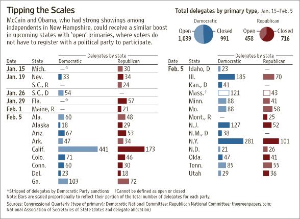 Michiganci danas glasaju i to samo za Republikanskog kandidata. Demokrati (Demokratska stranka) bojkotiraju Michigan. Očekuje se da će McCain pobjediti ovdje, unatoč okrnjenoj kampanji i nedostatku sredstava. McCain je pobjedio Busha u Michiganu 2000. No, kako smo vidjeli u New Hampshireu prošli tjedan, istraživanja mišljenja se nisu pokazala točnim u ovoj kampanji i došlo je to velikih obrata. Što je još zanimljivije, ne samo da su ispitivanja bila pogrešna, već i kladionice ili tržišta predikcija, su se pokazala lošim indikatorima. Ona bi u teoriji trebala imati puno kvalitetnije predviđanje jer agregiraju informacije na osnovnu kojih “investitori” biraju pobjednike i formiraju cijenu. U Michiganu 3 kandidata na Republikanskoj strani imaju realne šansu pobjediti. Michigan ima otvoreno glasanje, kao i NH, što znači da i neregistrirani, nezavisni, birači mogu glasati. Do sada ništa nije riješeno u prva dva glasanja i utrka je otvorena na obje strane. Glavni događaj je “Super Duper Tuesday”, 5. Veljače kada će se najvjerojatnije znati tko ima najrealnije šanse biti kandidat na obje strane.