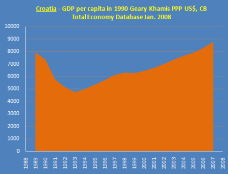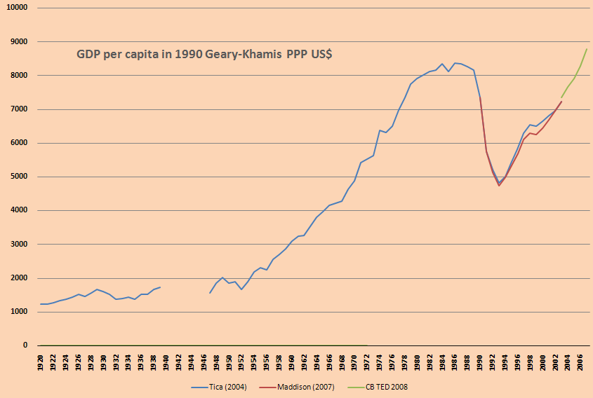 Do 1989. per capita BDP iznosi su prof. Tice. Od 1990. do 2001. Tica je prenio podatke (u tablici iznad) iz poznatog povijesnog rada Angusa Maddisona. Ja sam ih objedinio u jednu liniju – plava linija u grafu. Prekid u liniji je tokom drugog svjetskog rata. Nagli pad početkom 90tih je vrijeme Domovinskog rata i hiperinflacije. Treba istaknuti da je sami pad započeo već 1987 u odnosu na ’86.