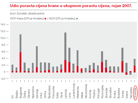 U razvijenim zemljama taj udio je između 10% i 20%; u zemljama u razvoju doseže i 65%. Primjerice u eurozoni taj udio je 14.7%; u Hrvatskoj udio je 27.7%. Zbog nižeg levela razvoja u Hrvatskoj (prihodovnog statusa većine građana), to je gdje se inflacija najviše osjeća prilikom mjesečne kupovine. Čak i u razvijenim zemljama, poput UKa, hrana je jedini dio gdje se vidi inflacija. Index bez hrane je u deflaciji. No, to objašnjenje/analiza utjecaja cijene dobara na ukupnu inflaciju je već poznata (osim možda Vladi koja je učinila gaf početkom godine i napala komunalije kao primarnog krivca za inflaciju).