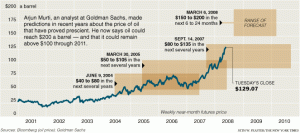 Arjun Murti je analyst sa Goldman Sachs investicijskoj kući. Održava niski profil, ne slika se, ali svojim (senzacionalnim?) izvještajima pokreće tržišta nafte, bar za dan. Nije da nema drugih analitičar koji predviđaju porast cijena, ali njegove analize su u isto vrijeme bile nevjerovatno visoke i točne. Dok je nafta bila na $40 on je predviđao preko $100, a 2004. je stvorio frazu “super spike” u kojem se sada nalazimo. U Svibnju je NYT imao članak o njemu (od kud i prvi graf). Da li je rijetko briljantan analitičar ili se radi o čistoj sreći, pitao je Daniel Altman sa IHT bloga Managin Globalization.