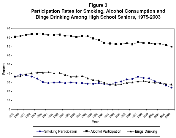 Zbog činjenice da su “štetne ovisnosti” (ne “rizična ponašanja”) osjetljive na cijenu, cilj Vlada diljem svijeta je kroz povećanje poreza smanjiti tu “štetnu ovisnost”. Zapravo, cilj naše Vlade, bazirano na onome što je Ministar Milinović rekao, je sakupiti određeni prihod iz poreza na duhan kako bi se pomoglo zdravstvenom sustavu u liječenju bolesti pušenja. To je poželjan i razumljiv cilj, ali im vjerojatno neće uspijeti onako kako se nadaju – ili kako Zombix misli da hoće. Mnoštvo empirijskih dokaza ukazuje na važnost novčane cijene u određivanju potražnje za cigaretama. Mnoge studije pokazuju na snažan negativni efekt cijene na potražnju za cigaretama. Generalni zaključak je da će uvođenje ili povećanje akcize za stalno povećati cijenu cigareta i tako imati značajan negativni efekt na potražnju za cigaretama – porezi nisu “bezveze.” Dva grafa niže to ilustriraju. U prvom se vidi povećanje realnih cijena cigareta između 1975.-2003. Dva razdoblja povećanja realne cijene su posebno uočljiva. Između 1980.-1992. cijena je porasla 88% kao posljedica povećanja federalne akcize tri puta. Između 1972.-2003 cijena je porasla za 72% kao posljedica povećanja federalne akcize dva puta, pojedinih državnih poreza i parnice 46 država protiv proizvođača cigareta. U drugom grafu vidi se smanjenje rate pušenja između 1975.-2003. (Klikni za uvećanje)