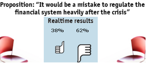 Na siteu magazina The Economist traje zanimljiva i potreban debata i glasanje na temu regulacije financijskog sektora. Propozicija koja se debatira i o kojoj se glasa je “Bila bi greška teško regulirati financijski sistem poslje krize.” “Za” tu izjavu je sada 38% glasova, “protiv” je 62%. Iza “za” argumenta je Myron Scholes, iza “protiv” argumenta je Joseph Stiglitz. Obojca Nobelovci iz ekonomije, imaju dobre argumente i pažljivo čitanje obojce vas može potaknuti da glasate za njegov položaj. Nijedan od položaja nije ekstreman koliko propozicija daje nagovjestiti. Čitaj dalje.