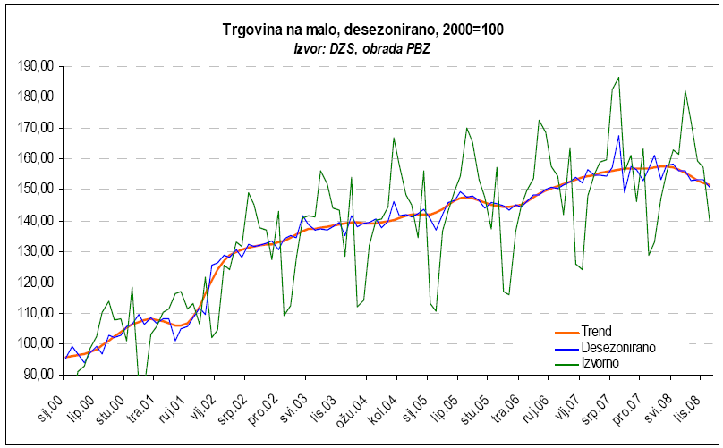 Zanimljiviji i važniji podaci su desezonirani (plava) ili pak dugoročna linija trenda (narančasta). Prvo, maloprodaja bilježi realni pad prodaje već četiri mjeseca zaredom (kolovoz, rujan, listopad, studeni). Drugo, ako malo uvećamo zadnji dio grafa, vidljivo je da je desezonirani i trend maloprodaje u padu veći dio 2008. godine. Nastavak takvog trenda, više izgledan nego neizgledan, kroz ovu godinu, ne donosi dobre prospekte za punjenje državnog proračuna, zaposlenosti u maloprodaji i ukupnoj potražnji. Ipak, mislim da je u odnosu na prošle epizode usporavanja (vidljive iz grafa) ovo naznaka duljeg i značajnijeg usporavanja u trendu, sa dubljih i dužim “koritom”, čak i ako Prosinac malo popravi sliku.