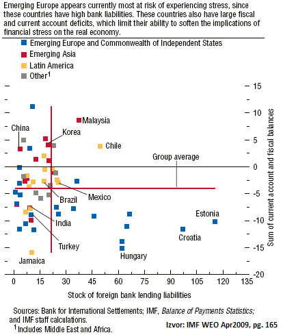 Graf ispod prikazuje položaj prema dvije dimenzije: udio obaveza prema stranim bankama i zbroj tekućeg računa i fiskalne ravnoteže (oba su u deficitu u hrvatskoj). (Podaci za razdoblje između 2002-06) Ništa što već ne znamo, ali graf daje lijepu perspektivu. Kao što i novi Bilten HNBa kaže (Okvir 3.) u Hrvatskom vanjskom dugu prevladavaju obveze prema stranim bankama, tj. dominira kreditiranje domaćeg sektora (bankarskog i nebankarskog) od strane inozemnih banaka, što je posebno naglašeno nakon 2002. godine. Ne treba posebno naglastiti da su te strane banke pretežno iz zapadno europskih zemalja. Upravo ta snažna financijska veza sa razvijenim zemljama i posebno bankarska veza, kako kaže WEO, je glavna prijenosnica financijskog stresa i krize na tržišta u nastajanju. “Ekonomije u razvoju (nastajanju) sa višim udjelom stranih obveza prema razvijenim zemljama više su pogođene financijskim stresom u razvijenim zemljama nego zemlje u razvoju koje su manje povezane.”