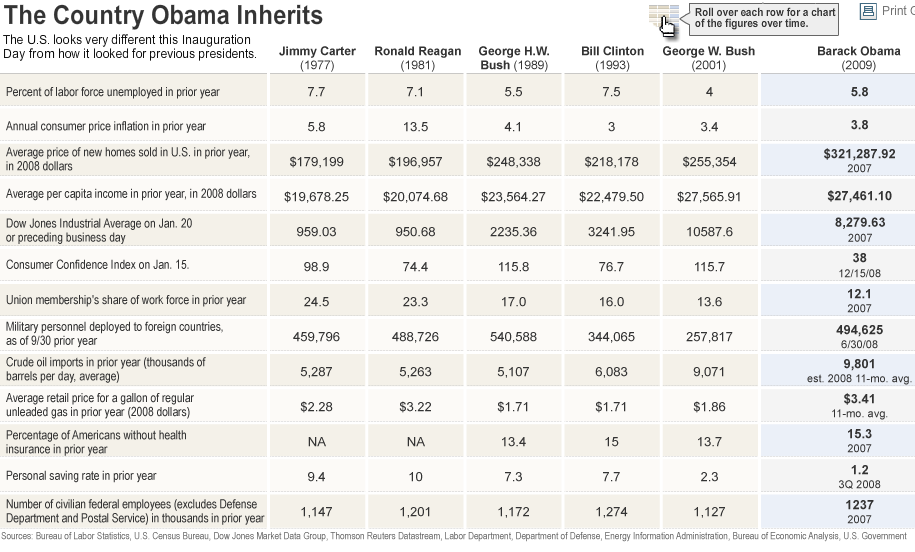 Grafički prikaz lijevo daje pregled ekonomske situacije koju Obama nasljeđuje i uspoređuje je sa nasljedstvom prijašnjih administracija. Jedan podatak koji nije prikazan je proračunski deficit. Projekcije za ovu godinu govore o deficitu od $1.2 bilijuna, ili 8.3% BDPa, bez predloženog stimulusa. Uz oko $825 milijardi stimulusa kroz dvije godine, deficit za 2009. bi dosegnuo $1.6 bilijun. Uredu je ako imate problema razmišljati o ovim brojkama. Ljudi smo. A i onaj tko bi nas sve trebao spasiti je isto samo čovjek, što će vrlo brzo postati jasno kao dan.