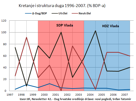 Jedan “na brzaka” napravljen graf iz Newsletter br42. Instituta Javnih Financija Dug hrvatske središnje države: novi pogledi, Srđan Tatomir.