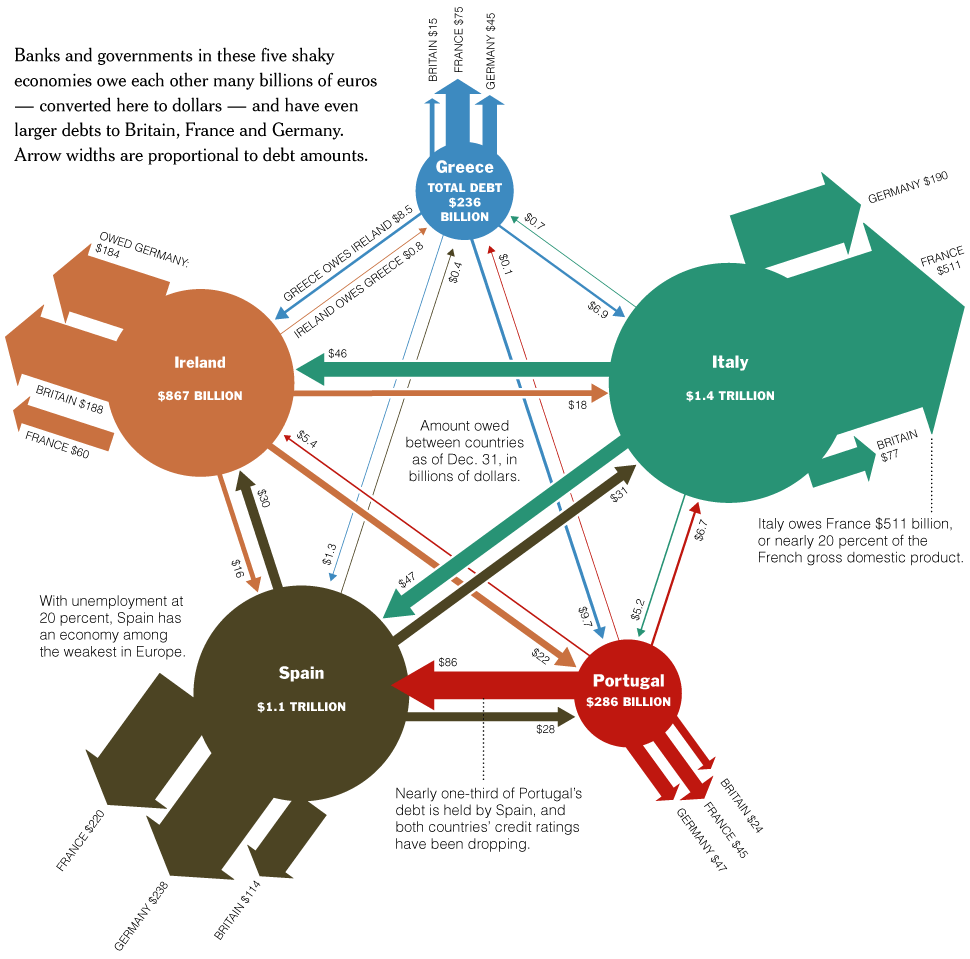 Ono što zanimljivo u svemu ovome je da su veličine dugova samo jedan aspekt koji je uznemirujući. Mreža dugovanja, sa vrstom dugovanja, je još više uznemirujuće, a kad tome dodamo i čistu obmanu, tako da se ne zna koliko se duguje i kome, dobijemo uistinu zastrašujući koktel za financijska tržišta, potrošače i poduzetnike. Kriza povjerenja. Za perspektivu, ispod je ‘karta’ Europske mreže dugovanja iz NYT.