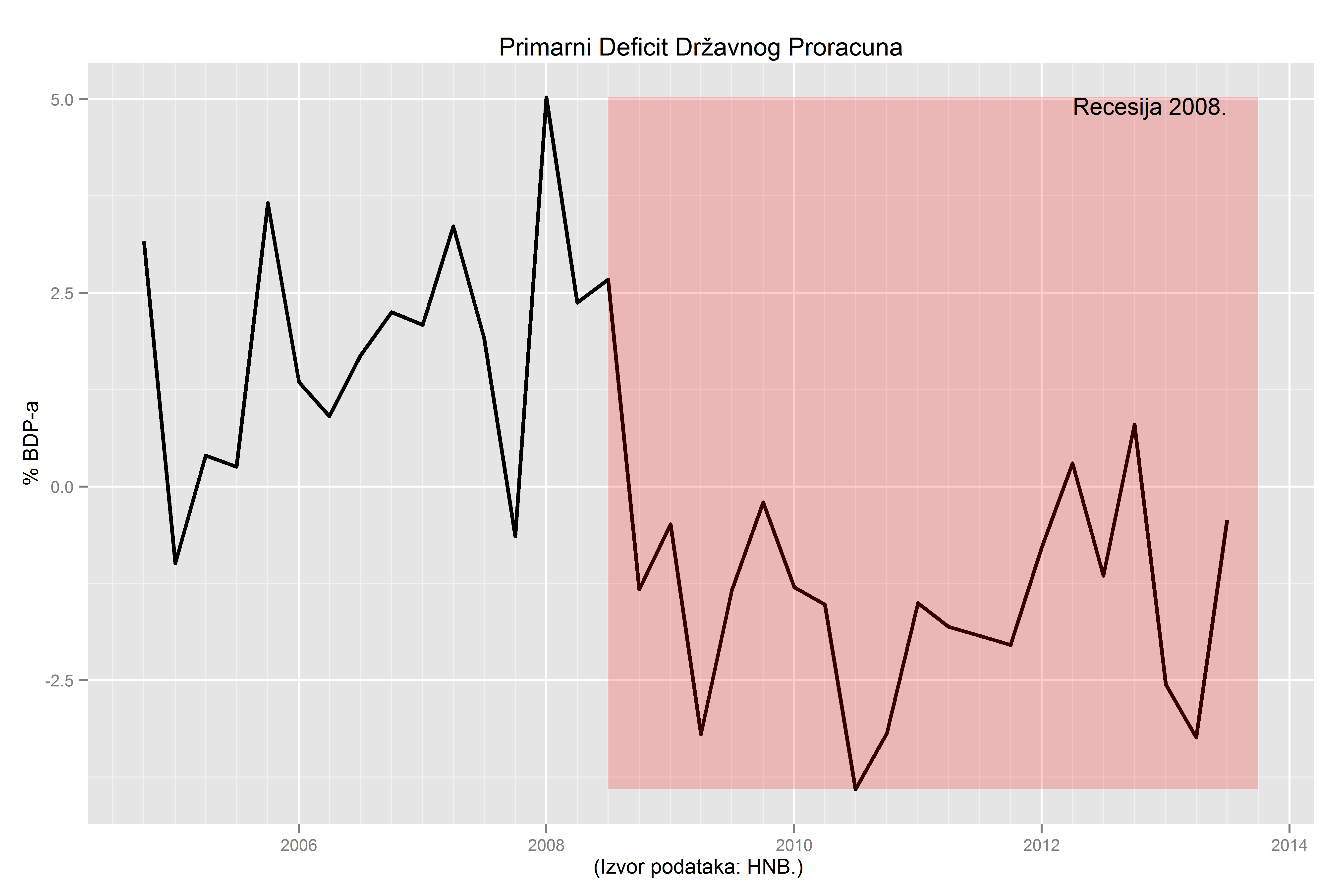 Jedan od faktora koji smanjuju javni dug je dosljedno vođenje primarnog suficita, što je razlika između prihoda i rashoda umanjenih za troškove kamata. Isplate za kamate su van utjecaja političara, ali ostala državna potrošnja na razne (socijalne) programe je. Donji graf prikazuje primarni deficit državnog proračuna, kao % BDPa, po kvartalima. Iako je izračun prljav, na brzinu, vidljiv je opet utjecaj recesije i nedjelovanje političara na razliku prihoda i rashoda ne uključujući kamate. Primarni deficit je zacementiran od početka recesije. Dok se to ne preokrene, ne treba se nadati smanjenju javnog duga.